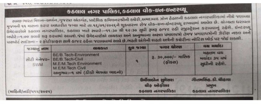 કઠલાલ નગરપાલિકા ભરતી 2026 ,પરીક્ષા વગર નોકરી મેળવવાની તક