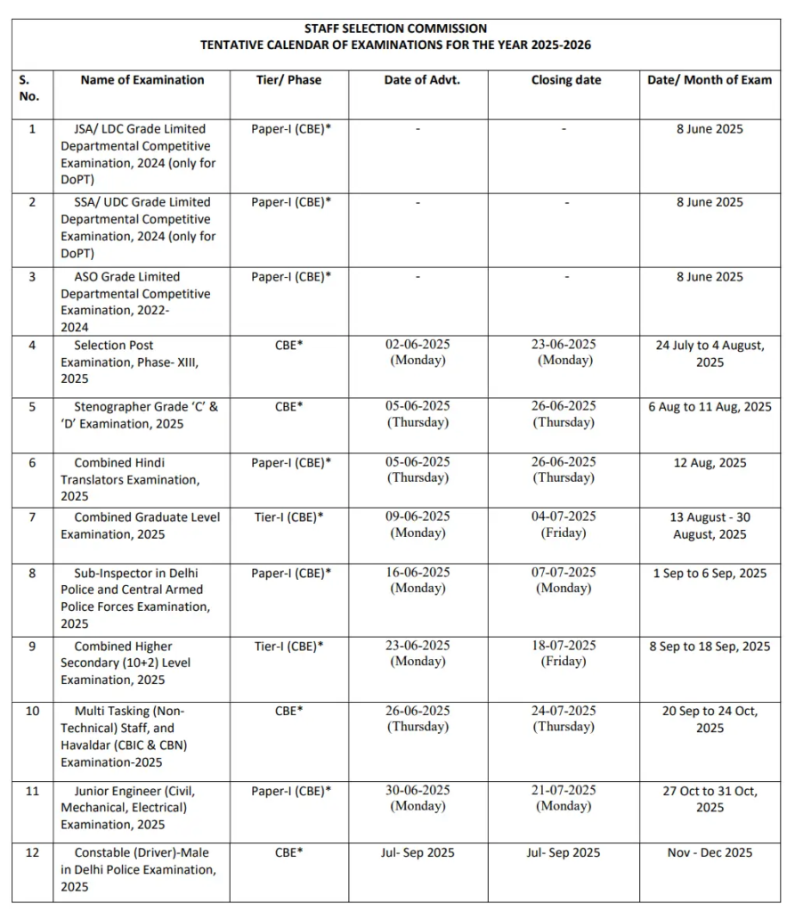 એપ્રિલ 2026માં પસંદગી પોસ્ટ ફેઝ-XIV, CHSL, સ્ટેનોગ્રાફર ગ્રેડ C અને D તથા સંયુક્ત હિન્દી અનુવાદક પરીક્ષાઓ માટે સૂચનાઓ બહાર પાડવામાં આવશે. આમાંથી કેટલીક પરીક્ષાઓ મે 2026માં શરૂ થશે, જ્યારે કેટલીક પરીક્ષાઓ ઓગસ્ટથી સપ્ટેમ્બર 2026 દરમિયાન યોજાશે. MTS અને હવાલદાર ભરતી માટેનું નોટિફિકેશન જૂન 2026માં આવશે અને તેની પરીક્ષાઓ સપ્ટેમ્બરથી નવેમ્બર 2026 વચ્ચે યોજાશે.